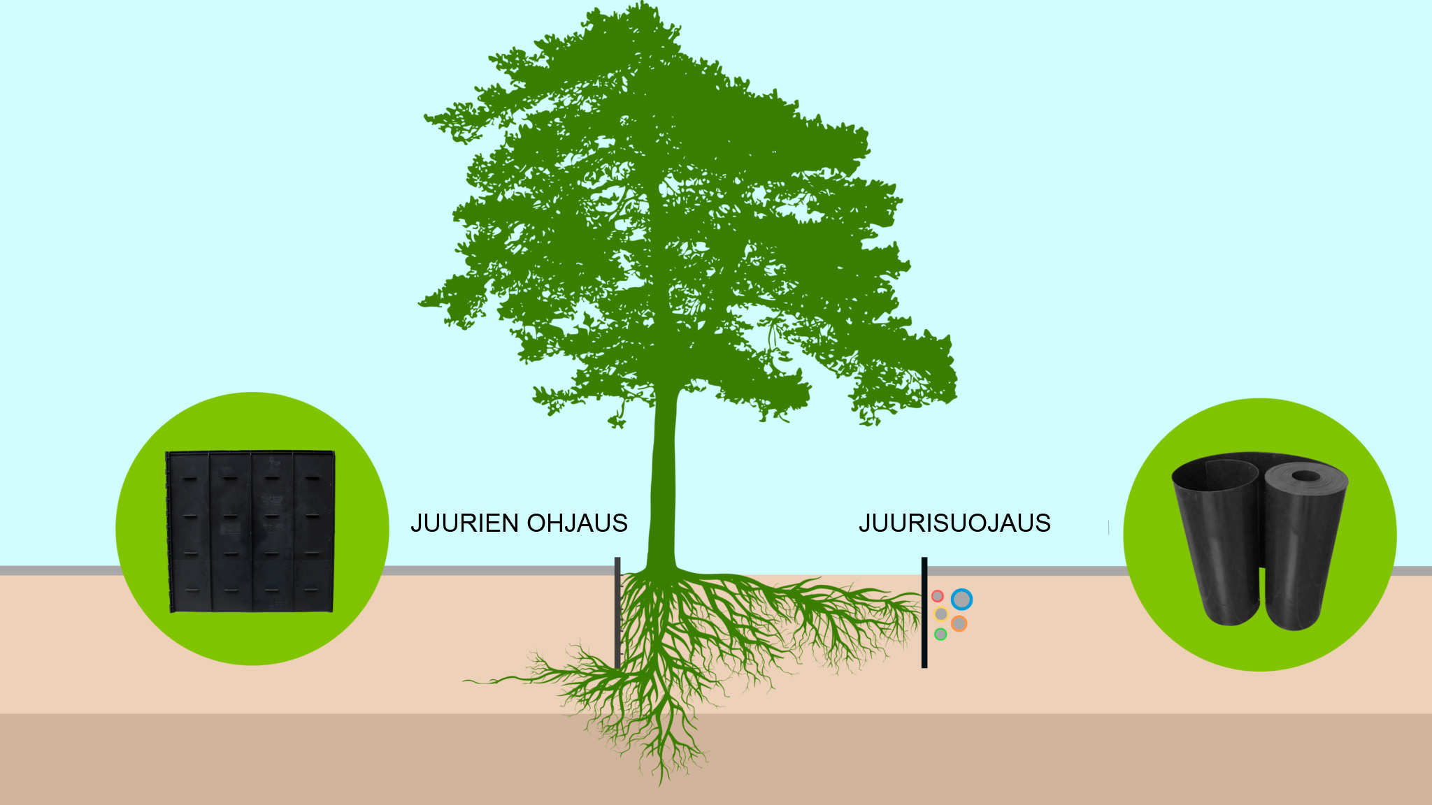 Juurisuojauksella estetään juurien leviäminen tietyn alueen ulkopuolelle ja suojataan yksittäisiä kohteita, kuten putkia, juurien tunkeutumiselta. Käytännössä siis juurien kasvu tiettyyn suuntaan pysäytetään, minkä jälkeen ne jatkavat kasvuaan saavuttamansa esteen myötäisesti. Tähän tarkoitukseen voit käyttää RootControl-juuriestekankaita tai RootBlock-juuriesteitä, jotka ovatkin monikäyttöisyytensä ansiosta olleet jo useiden vuosien ajan alan ammattilaisten luottotuotteita. RootBlock-juuriesteitä on saatavilla kierrätysmateriaalista sekä biopohjaisesta ja HDPE-muovista valmistettuna.