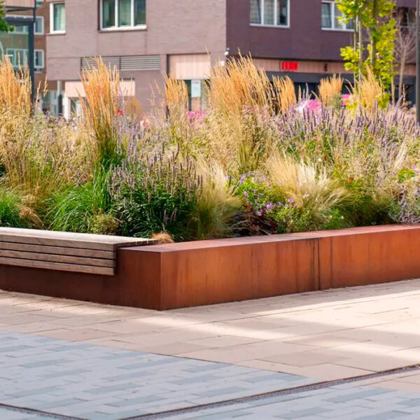 Corten-reunatuki – leveä yläreuna kuuluu samaan tuoteperheeseen kuin Corten-reunatuki – kapea yläreuna ja Corten-reunatuki – kapeneva, joten valikoimasta löytyy sopiva vaihtoehto eri kohteiden mittakaavoihin ja käyttötarkoituksiin – visuaalisesta keveydestä jämäkkään istuttavuuteen.