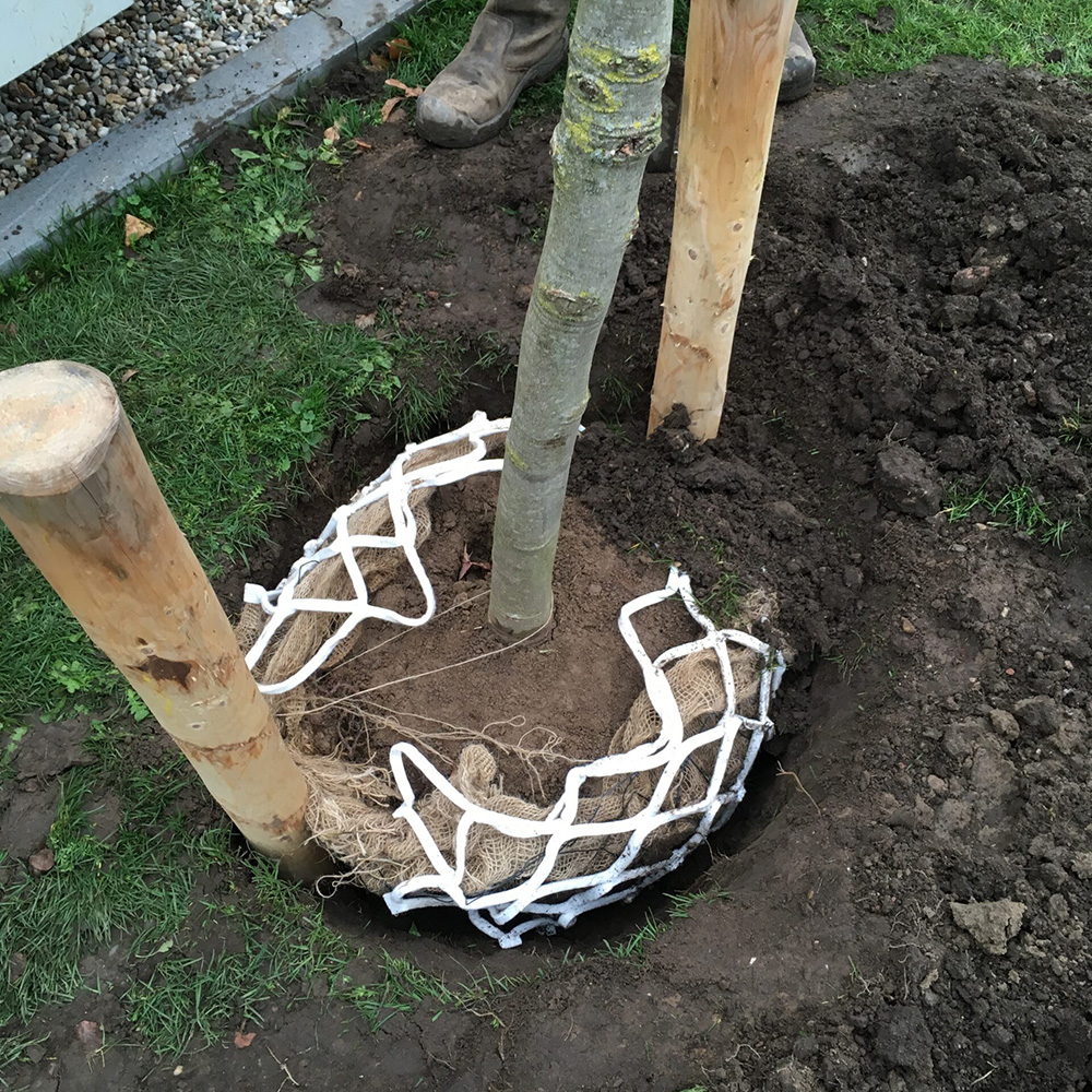 - Täytä istutuskuoppa normaalisti. Vesi ohjautuu verkon kautta suoraan juurille.